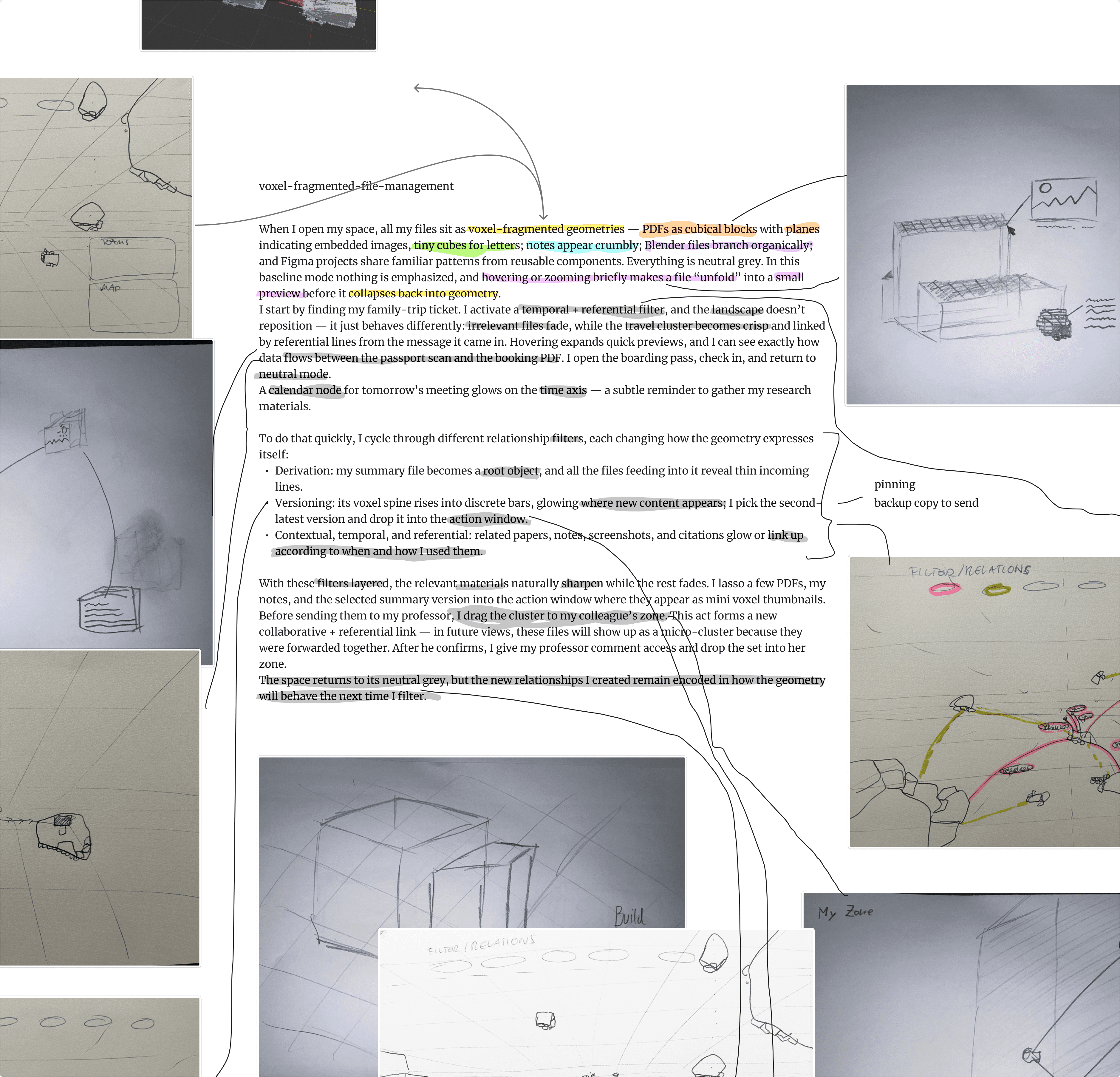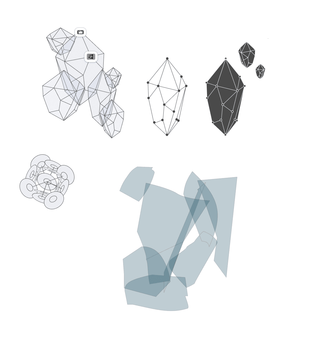 The project imagines an alternative file system beyond folders and icons. Files appear as geometric objects whose form and materiality carry meaning about versioning, relations, and collaboration. Organisation emerges through interaction, specifically filtering on the search level. The system becomes a spatial illustration of what files are today: dynamic, networked, processual, fractal.