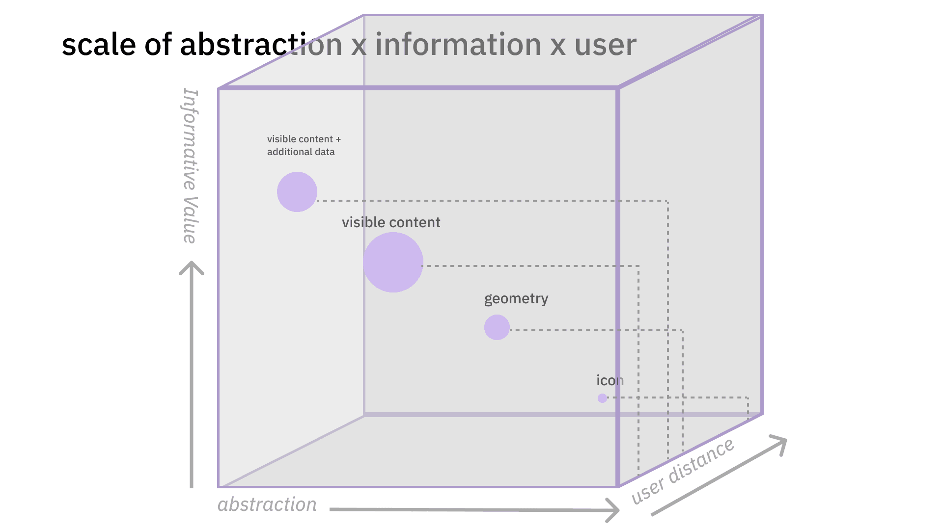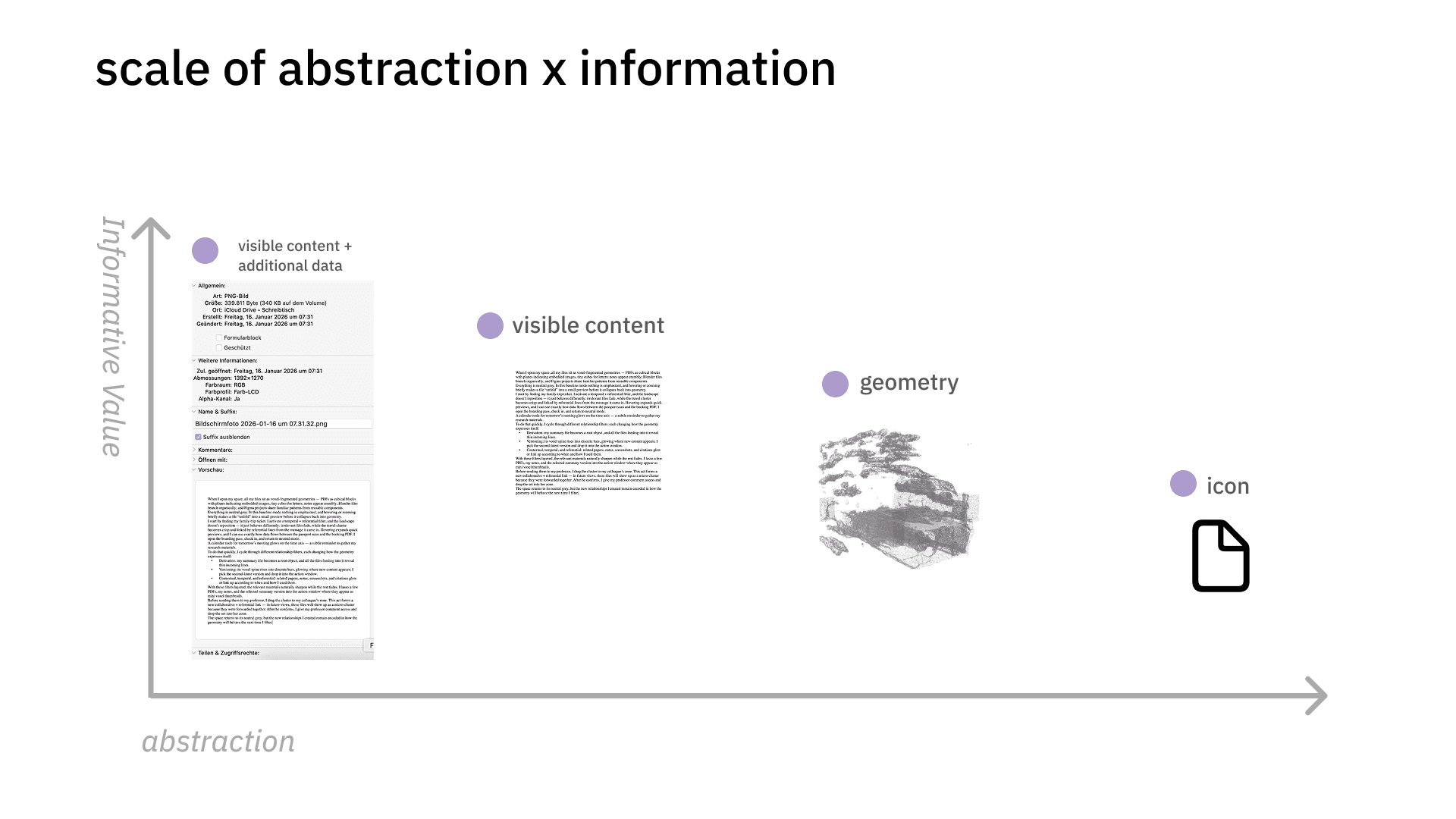 When bringing a third dimension into the matrix, which is the user distance, an expression summarizing informational value and abstraction the geometry positions itself again somewhere in between, possibly nearer the preview, holding up the position for even further deconstruction of its visual parts and contents holding the potential for recognition and file-specific memorability.