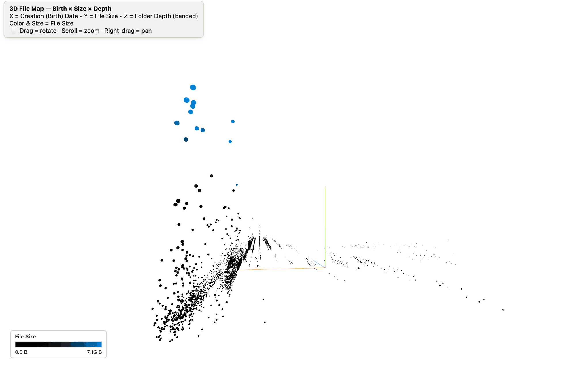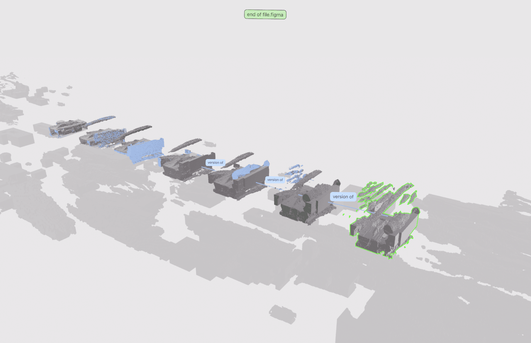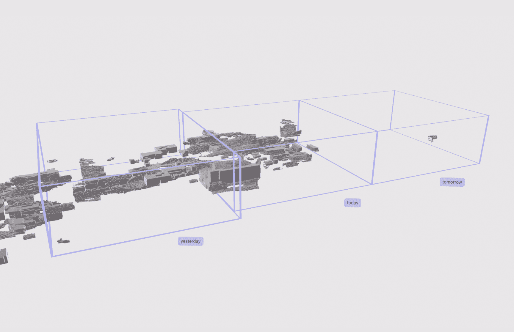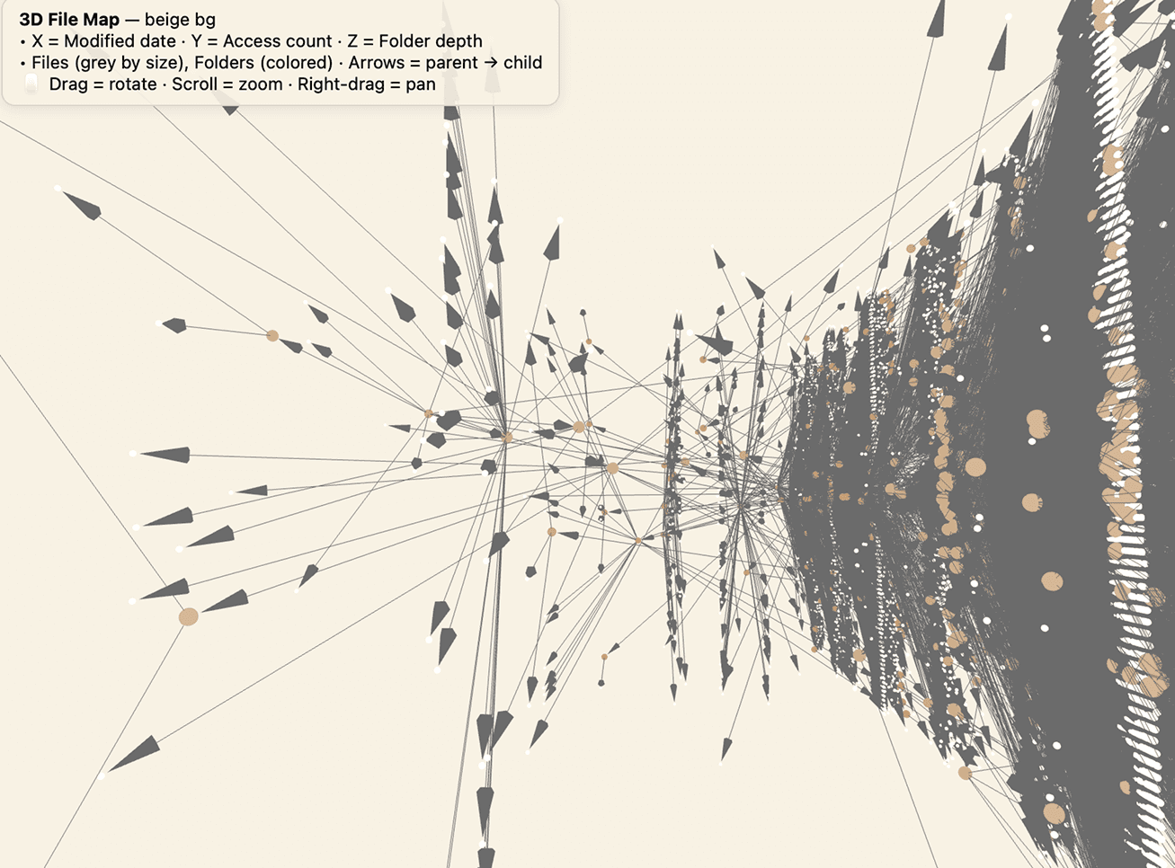 Visual impulses, partially based on data visualisations exploring file structures that laid the ground for designing with time as the main compositional and organisational factor, alongside a second concept that approached files as semantic entities capable of forming meaning-based clusters carrying a strong visual impulse led to translating the information within a file into 3D geometry.