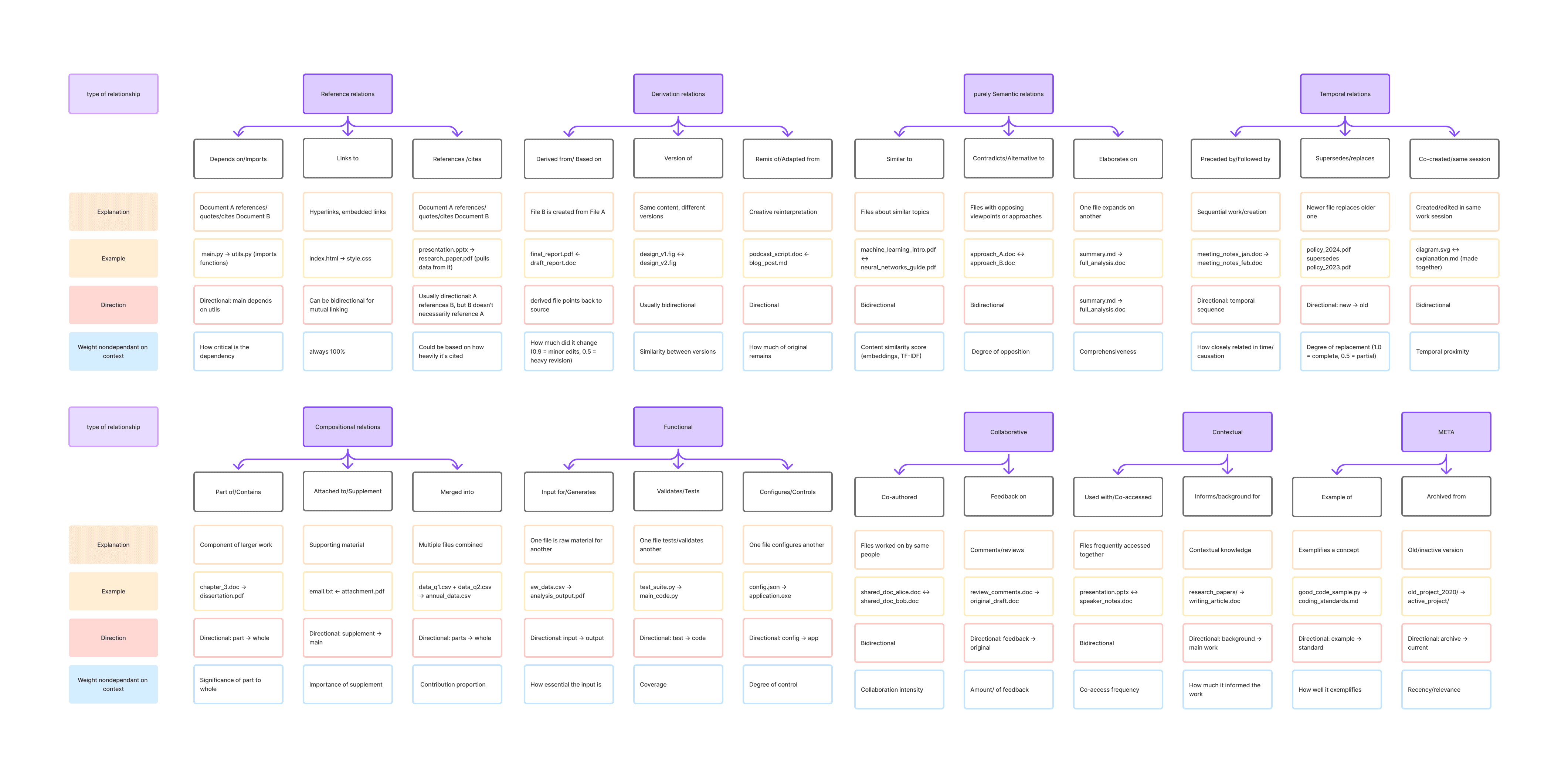 The system is search-based, relying on time, relationships, and type rather than names. Filters enable detailed, customizable search, allowing users to move between files through relational chains in time. Files can also be grouped within collaborative spaces and tagged in more complex ways using nodes for automation supporting tagging, and collaboration-based classifications.