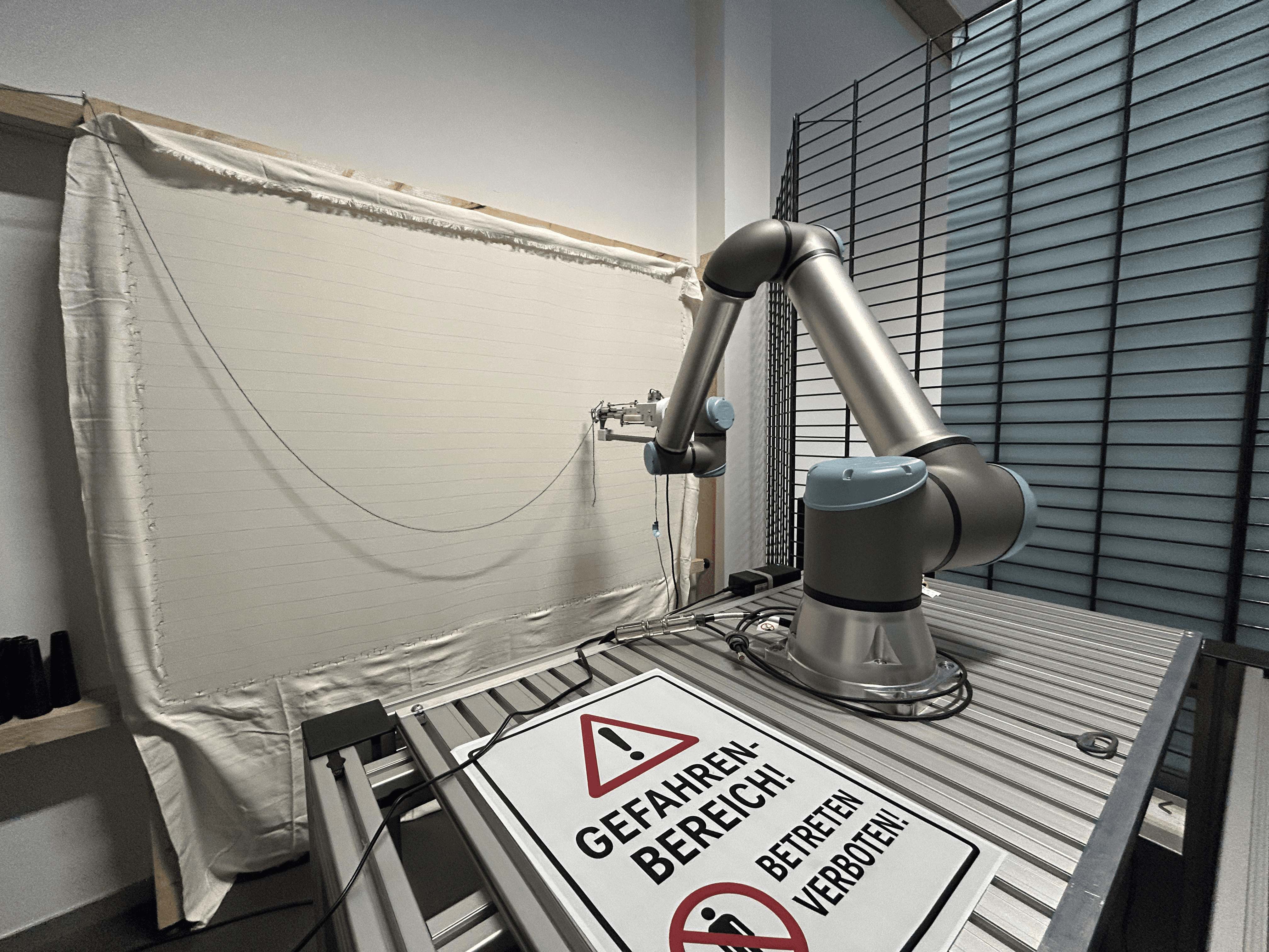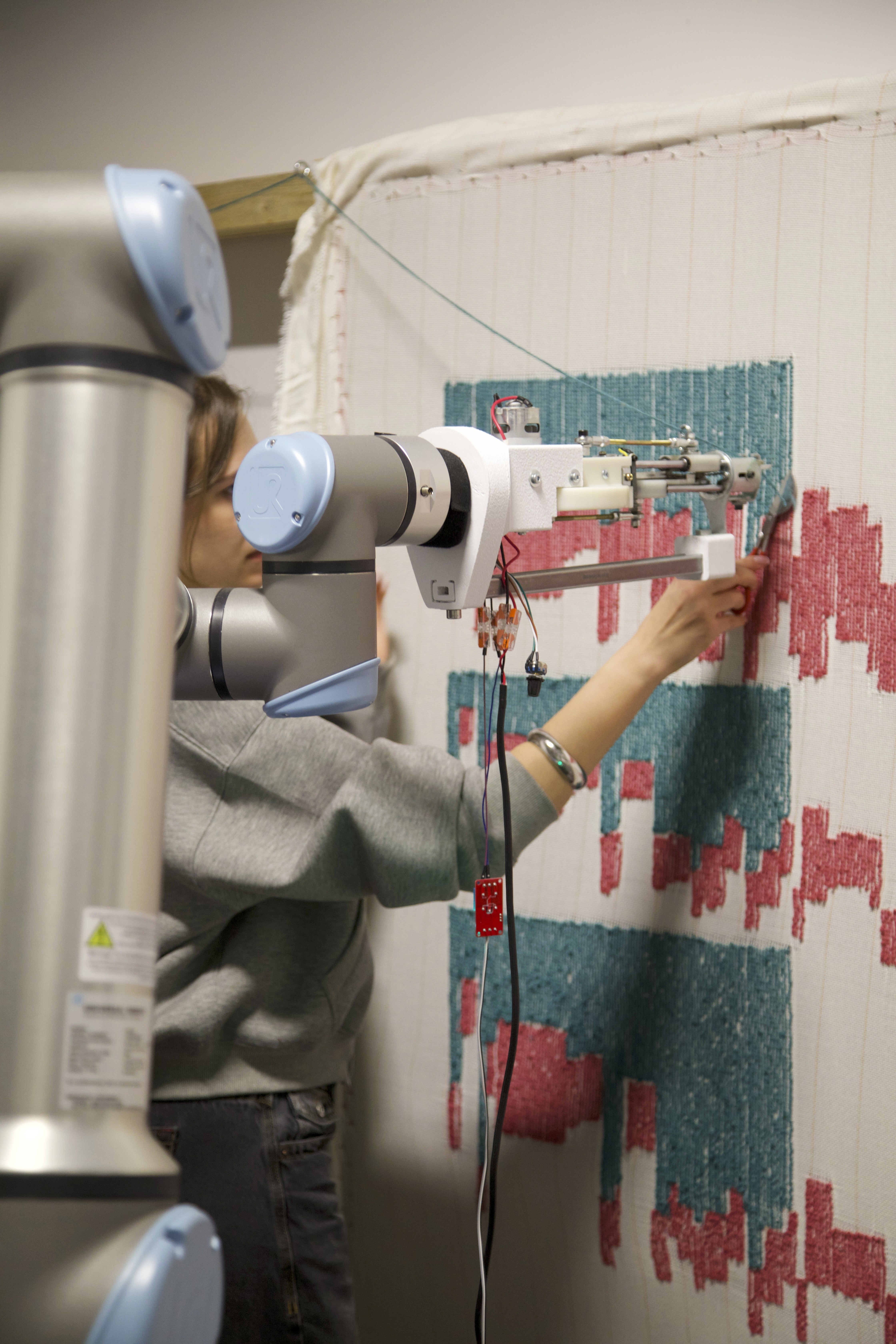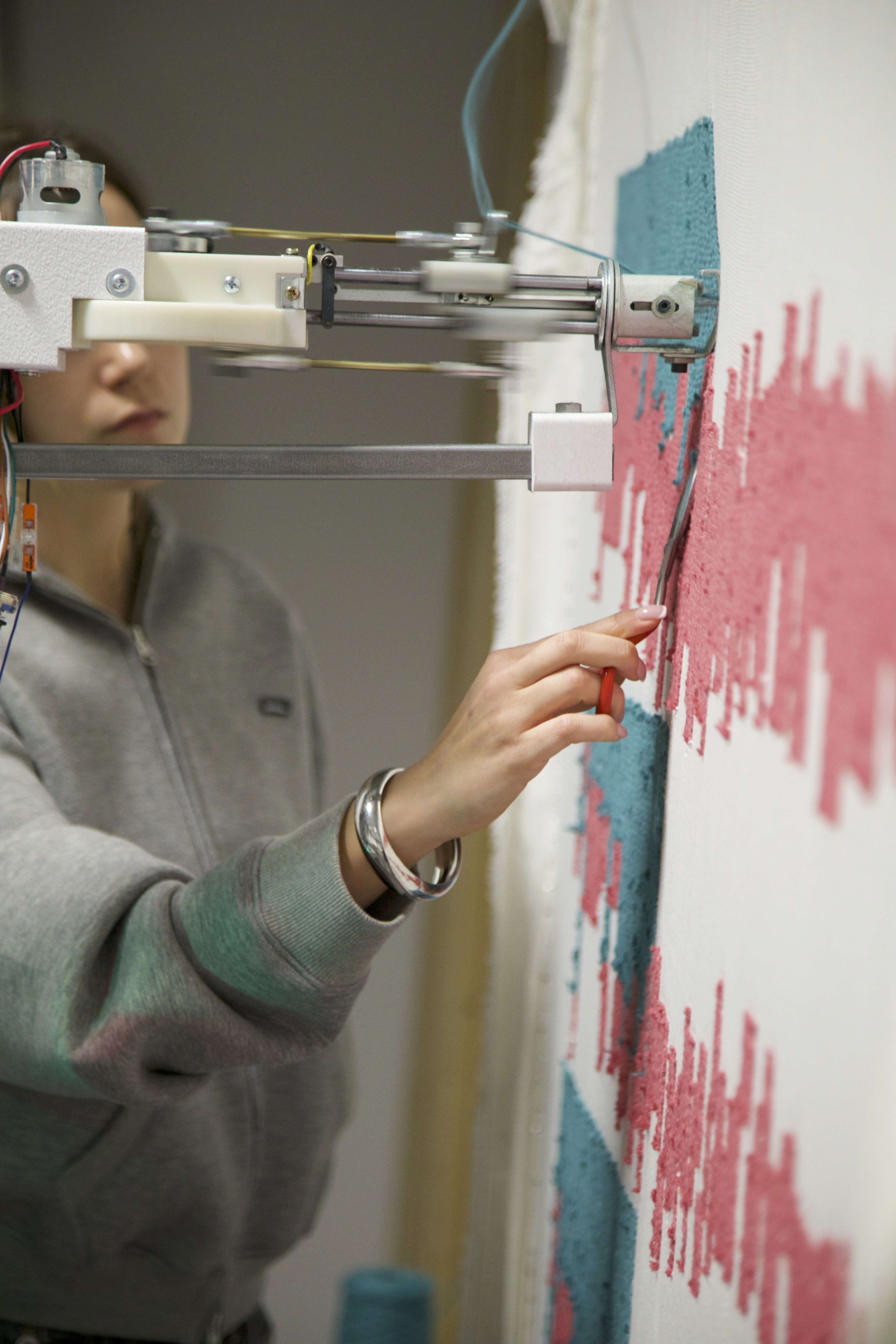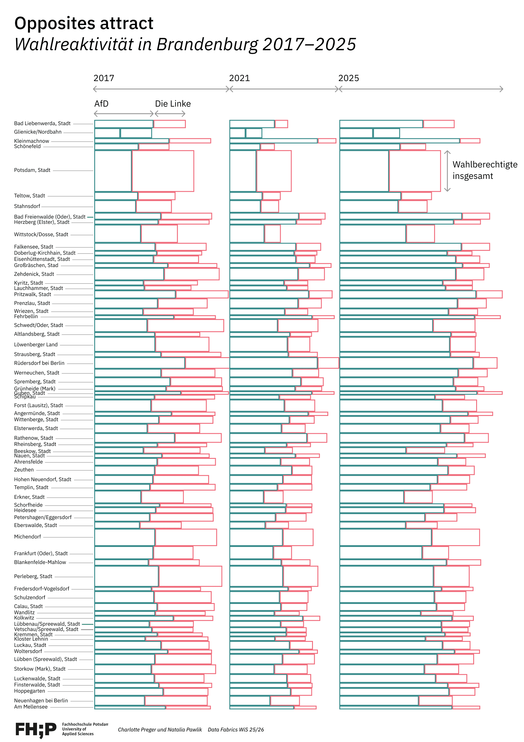 The graphic examines whether reactivity in voting behaviour between political extremes can be identified as a cross-aggregate phenomenon within Brandenburg. It is produced using a robot arm that tufts the data onto a large canvas, transforming the visualisation into a woven, rug-like surface.