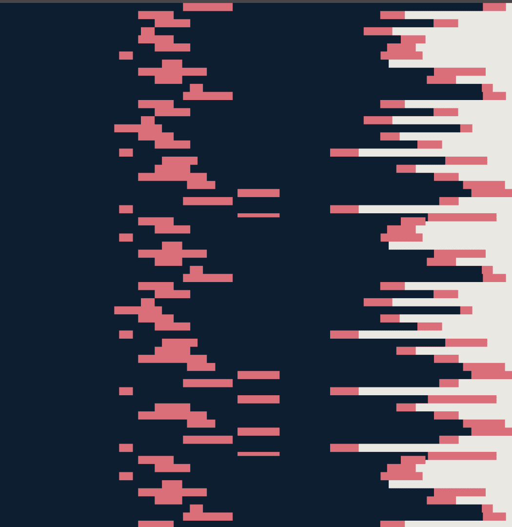 The graph shows the 100 municipalities with the highest share of votes for the AfD and is sorted according to the reactivity coefficient. Red represents the percentage of votes for Die Linke, blue for the AfD. The background is white because the focus is on the dynamics between the parties, not on the total number. Each line represents a municipality, and the height of the line represents the number of eligible voters.