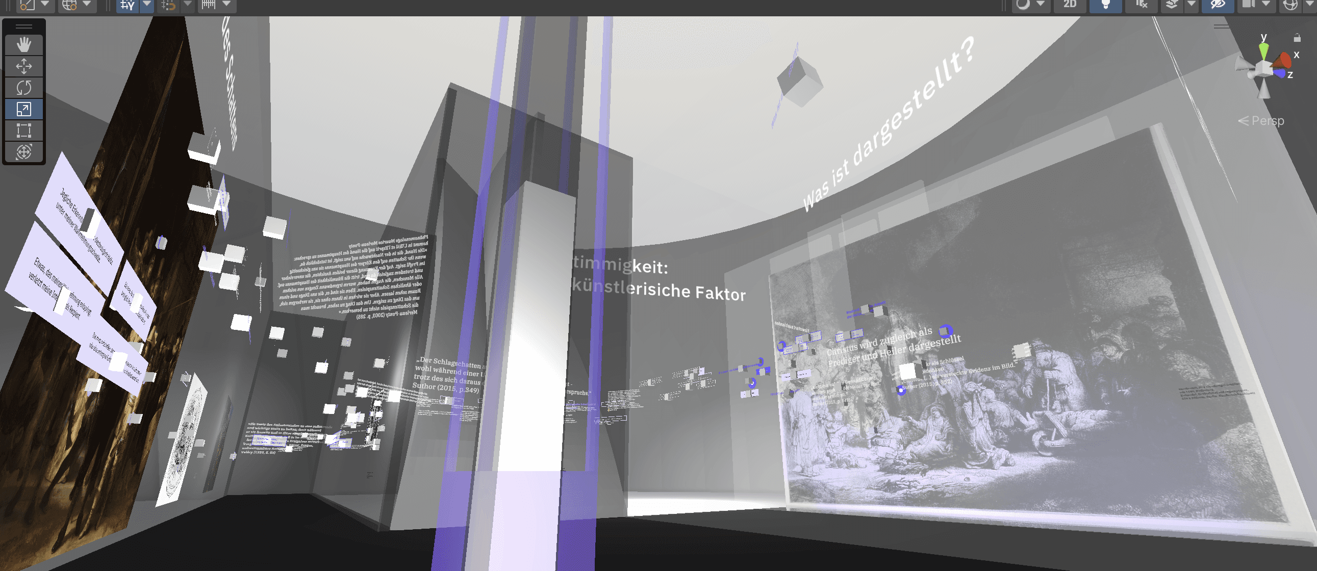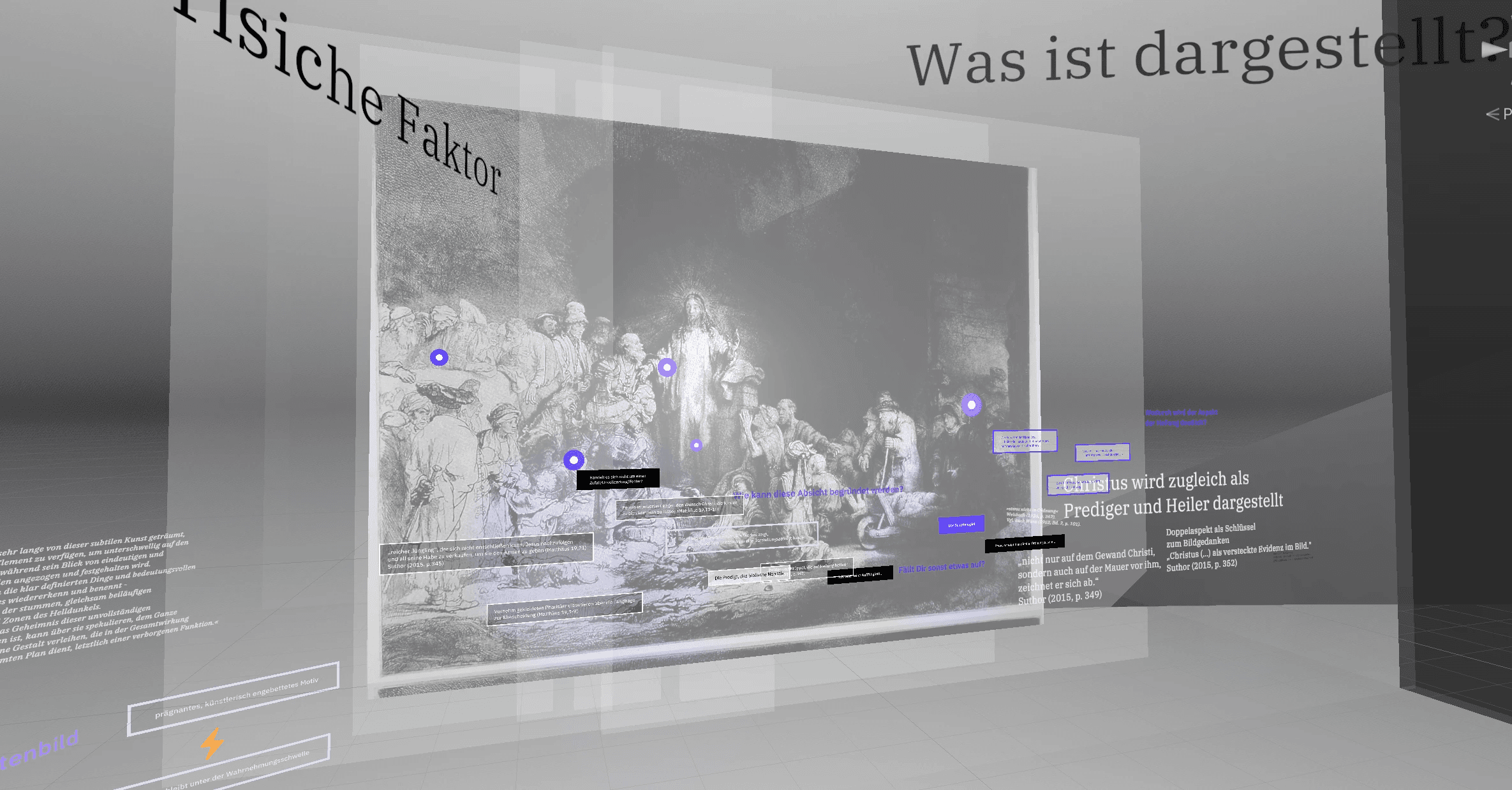 The project involves the development of a 3D flowchart that presents an analysis of Nicola Suthor’s essay Ein Schattenspiel. Rembrandts „Hundertguldenblatt“ (A shadow play. Rembrandt's ‘Hundred Guilder Print’). Its main aim is to guide the user through the author’s multi-layered lines of argumentation and to actively involve them in the reception of the work, enabling an understanding of Suthor’s theses and their conclusive plausibility.